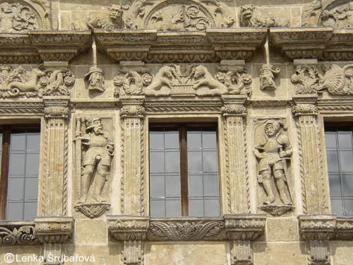 Dům U Rytířů byl postaven v renesančním slohu v polovině 16.století. Je jedním z nejkrásnějších domů v Litomyšli. Původní vzhled domu doplňoval vysoký renesanční štít, který byl později nahrazen empírovou atikou. Kamenná fasáda domu je zdobena reliéfní dekorativní a figurální výzdobou, jejíž náměty jsou čerpány z dobových grafických předloh. Své jméno dostal dům podle postav dvou rytířů umístěných po stranách prostředního okna. Kromě rytířů zdobí fasádu ještě další figury - student, kupec, mořská panna, lev, jednorožec a další.