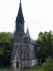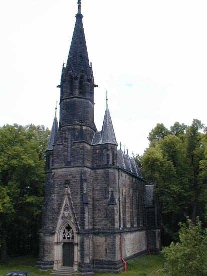 Jedná se o štíhlou pseudogotickou stavbu, které dominuje vysoká věž. Postavena byla jako soukromý thunský svatostánek nad rodovou kryptou, kterou zde nechal rod Thunů zřídit v letech 1822 a 1835 pod tehdy přestavovanou bývalou kaplí. Ostatky rodu Thunů z 18. a 19. sem byly přeneseny po stržení loretánské kaple na děčínském náměstí. Členové hraběcí rodiny zde byli pohřbívání až do roku 1935. V roce 1995 došlo ke zpopelnění ostatků jedenatřiceti členů rodu a k uložení schránek do krypty kostela Povýšení sv. Kříže.