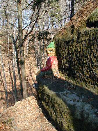 Takzvaná Trpasličí skála se nachází v lese podél levé strany silnice z Jetřichovic na Rynartice. Na konci 19. století zde místní občan Ernst Valter se svým synem vytesal do skály trpaslíky. Nebylo to zrovna jednoduché, v některých částech museli skálu upravit, vytesat místo pro cestu a schody. Když byli s prací hotovi, vykukovali z pískovcové skály reliéfy sedmi trpaslíků. Hotové trpaslíky vymalovali barvami podle pohádkových knížek. Jeden odpočívá na kamenné lavičce a vypadá, jako by nás zval, abychom přisedli. Další sedí a čte si v knize. Později zde vznikl i portrét Sněhurky, která na místě původně chyběla. Vytvořil ji neznámý autor.