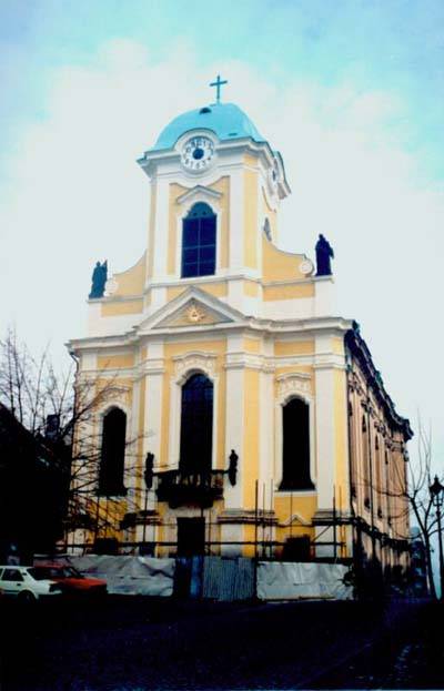Kostel byl vybudován na místě staršího kostela ze 14. století. Současná stavba je z roku 1772, byla postavena ve slohu pozdního baroka. Na římse západního průčelí jsou po obou stranách věže umístěny sochy sv. Petra a Pavla z doby kolem roku 1770. V kostele je malovaná oltářní architektura, práce Adama Lauterera a Josefa Kramolina. Nejcennější je oltářní obraz Panny Marie v rozhovoru se sv. Petrem a Pavlem, práce Karla Škréty z roku 1656. Proti kazatelně je oltář Kristova života s obrazem narození Krista, dále jsou tu oltáře sv. Anny, sv. Josefa, sv. Jana Nepomuckého a sv. Rodiny. Pozoruhodná je kamenná křtitelnice nezvyklého typu a rokokových tvarů.