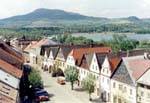 V západní části náměstí se zachovala řada štítových domů, které názorně ukazují jak vypadala zástavba menšího středověkého města. Jde o domy č.p 16/29 až 28/42. Nejstarší městské domy byly patrně dřevěné, ale měly kamenné sklepy. Tyto sklepy jsou často v několika úrovních. Na přelomu 15. a 16. století došlo k velkému stavebnímu rozvoji ve městě, byly stavěny nové kamenné a hrázděné domy s loubím. Jejich štíty byly vesměs dřevěné. V domě č.p. 19/32 se zachovala původní černá kuchyně, dům č.p. 16/29 má novější rokokové průčelí.