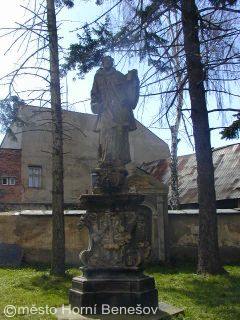 U kostela je socha sv. Jana Nepomuckého, která byla původně na náměstí. Je to barokní plastika z 2. poloviny 18.století, pískovcová socha světce v tradičním oděvu s biretem v pravé a křížem v levé ruce. Na šestibokém stupni podnož obdélného půdorysu a na ní podstavec bohatě zdobený reliéfními ornamenty, mezi nimi světcův jazyk na svatozáři mezi oblaky. Na profilované římse podstavce klečí andílci.