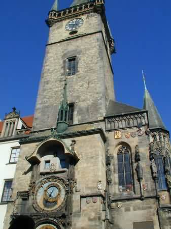 Unikátní je zdejší orloj, který pochází již z roku 1410, v roce 1490 ho opravil mistr Hanuš. Každou denní hodinu se v okénkách objevuje 12 apoštolů, pohyblivé jsou i horní figurky Marnivce, Lakomce, Smrtky a Turka. V dolní části je umístěna kalendářní deska se znameními zvěrokruhu od Josefa Mánesa.