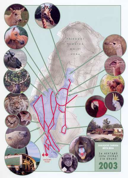 *fotoid_12_2*Zoologická zahrada města Brna byla pro veřejnost otevřena 30. srpna 1953, v roce 2003 tedy oslavila své padesáté výročí. Rozkládá se na 65 hektarech lokality Mniší hora v Brně-Bystrci, v těsné blízkosti Brněnské přehrady. Ročně ji navštíví kolem 230 000 návštěvníků, kteří mohou zhlédnout okolo 1100 zvířat 218 druhů. Zahrada se také stará o poraněná zvířata z okolní přírody, která přinášejí občané do Stanice pro handicapované živočichy, a současně slouží jako Záchytné centrum pro pašovaná zvířata zadržená celníky. Zoo Brno se také podílí na Evropském záchovném programu (EEP). V tomto programu chová 18 druhů, mezi nimiž jsou savci, ptáci i plazi.