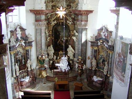 Fresková výzdoba vyšla z ruky Jana Jakuba Steinfelse ze Steinfelsu. Všechny fresky jsou tématicky vázány k proroctví o Kristově příchodu - v klenbě jsou vyobrazeni Mojžíš a starozákonní proroci, v kápích a lunetách nad okny jsou Sibyly. vPro svoji výjimečnou architekturu byl kostel v roce 1996 prohlášen za národní kulturní památku. V kupoli presbytáře je vyobrazeno Stvoření světa, v kupoli nad oratoří je to pak Bůh otec mezi Kristovými předky. Kartuše na stěnách zobrazují Příchod tří králů a Heroda mezi zákoníky.