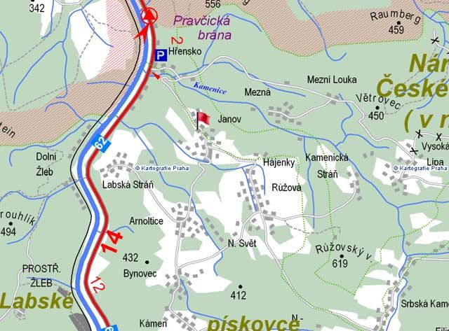 Penzion naleznete v obci Janov, která je situována na pískovcové skále nad Hřenskem, cca 3 km od hraničního přechodu Hřensko ? Schmilka. Klidné a čarokrásné prostředí na samé hranici Národního parku České Švýcarsko je tradiční oblastí horolezců a je přímo stvořeno pro pěší turistiku, zaměřenou především na návštěvy atraktivních přírodních scenérií, jako je např. Pravčická brána a Soutěsky. V zimě má zdejší oblast své kouzlo a romantiku. Pro milovníky lyžování je dispozici několik vleků (Jedlová - Tolštejn, do 10-15 km). V létě se penzion může stát výchozím místem pro výlety do nejnavštěvovanější části Labských pískovců jako je Hřensko, ležící na soutoku Labe s Kamenicí. Skládka dřeva a vorařská krčma jsou zde připomínané už v roce 1445. Z Hřenska se můžeme vydat právě k největším atrakcím Labských pískovců - do Divoké a Tiché soutěsky nebo na Pravčickou bránu, největší skalní most ve střední Evropě o výšce 16 m a rozpětí 26 m. Dále můžete navštívit zbytky skalních hrádků Šaunštejn a Falkenštejn, překrásnou vyhlídku do labského údolí Růžového hřebenu, Kyjovské údolí na říčce Křinici nebo roubené hrázděné domy ve Vysoké Lípě. Stejně přitažlivá jsou místa jen mírně vzdálenější, avšak pohodlně dostupná na kole či autem. Pokud byste zatoužili po ruchu města, můžete zavítat do nedalekého Děčína, kde najdete řadu služeb, které Vám mohou zpříjemnit zdejší pobyt (banky, bankomaty, krytý bazén, ZOO ...).