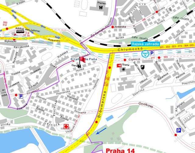 Banka 2km, bankomat 300m, pošta 200m, autobusová zastávka 100m, metro Rajská zahrada 350m (20min.), vlaková zastávka 3km, nákupní centrum 2km, obchod 200m, krytý bazén Lagoon 4km, tenisové kurty 2km, bowling 2km, squash 500m, fitness 2km, taxi v místě, pěší turistické trasy v místě.