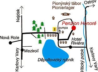V bezprostředním okolí penzionu se nachází romantické okolí s nádhernými výhledy do krajiny. Je zde několik jízdáren, které Vám umožní prohlédnout si zdejší krajinu ze sedla koně. V letních měsících je zde nádherné koupání v jezeře, které ocení i rybáři. Celá oblast je ideální jak pro pěší, tak cykloturistiku, ani houbaři nepřijdou zkrátka. Pokud by se Vám zastesklo po ruchu města, můžete navštívit nedaleké Karlovy Vary, kde naleznete všechny potřebné služby a další možnosti vyžití, jako banky a bankomaty, nákupní centra, tenisové kurty, golf, squash a podobně. Po dohodě lze také zajistit výlety do okolí, či exkurze do závodů Becher, nebo skláren Moser a Karlovarské porcelánky.