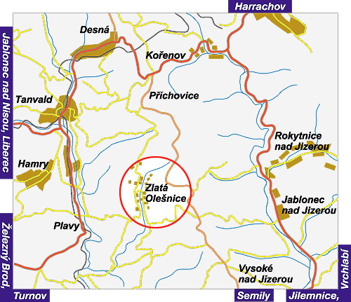 Banka - 7 km; bankomat - 7 km; pošta - 1,5 km; autobus - 1,5 km; vlak - 1,5 km; nákupní centrum - Tanvald; obchod - Příchovice; koupaliště - Tanvald, Zlatá Olešnice; krytý bazén - Tanvald; Jablonec n/N; mini golf - Příchovice; golf - Harrachov; bowling - Kořenov; taxi - Tanvald.