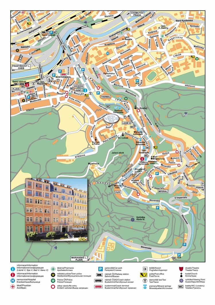 Hotel Venus se skládá ze tří budov, jejichž stáří přesahuje sto let. Po úspěšné rekonstrukci byl 1. 4. 2001 uveden do provozu jako čtyřhvězdičkový hotel. Nalézá se v samotném srdci lázeňské čtvrti, několik málo kroků od Mlýnské a Sadové kolonády. Prameny i exkluzivní nákupní centra se nacházejí v bezprostřední blízkosti hotelu. Osobním automobilem můžete přijet přímo před hotel, pro dopravu po městě lze využít městské autobusy.